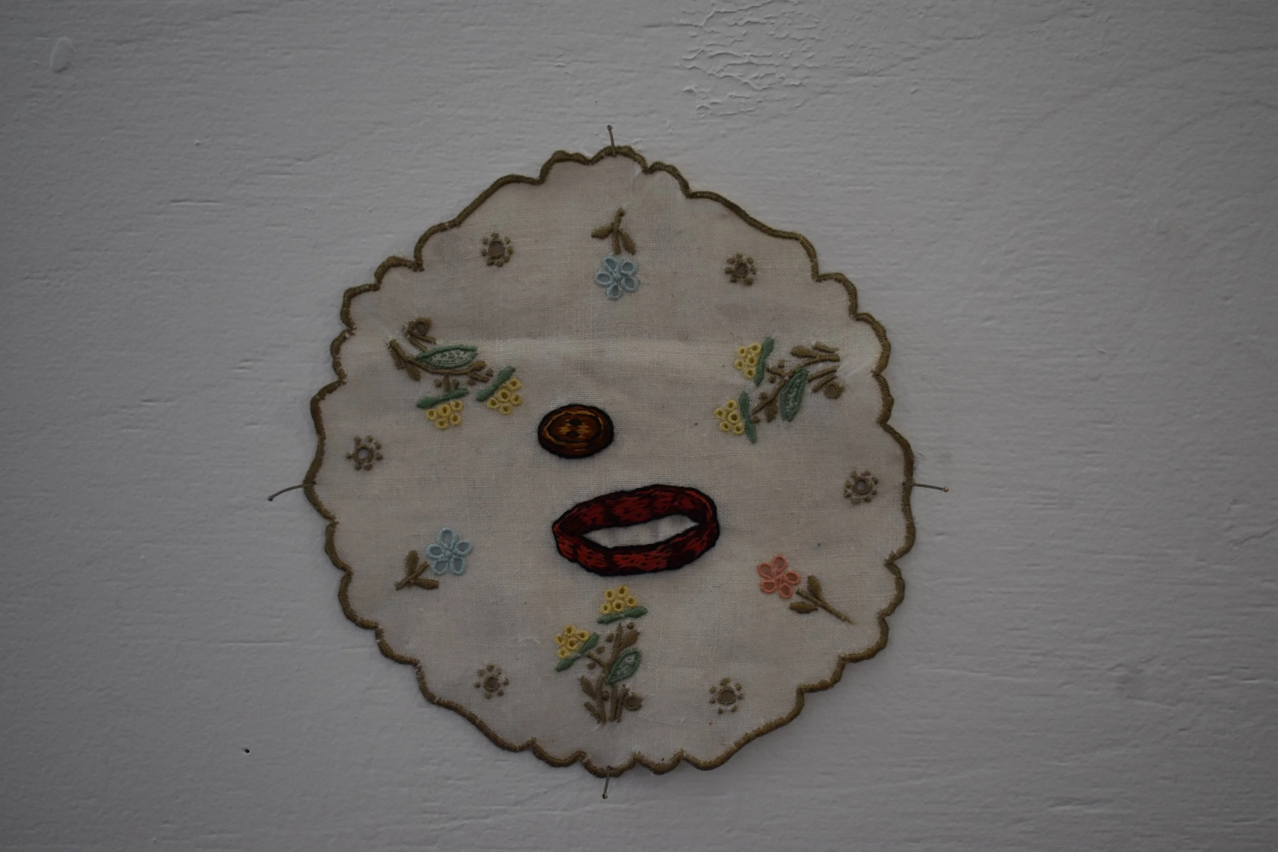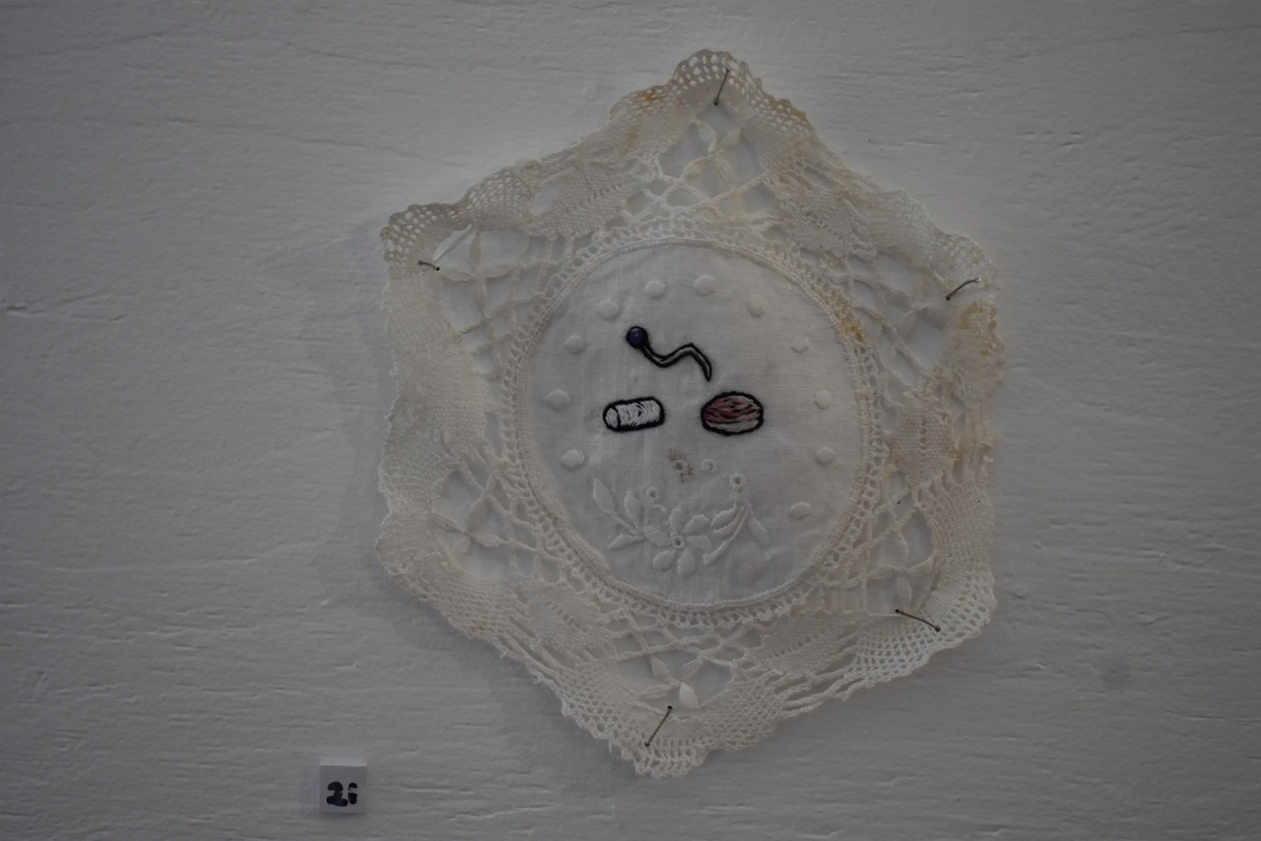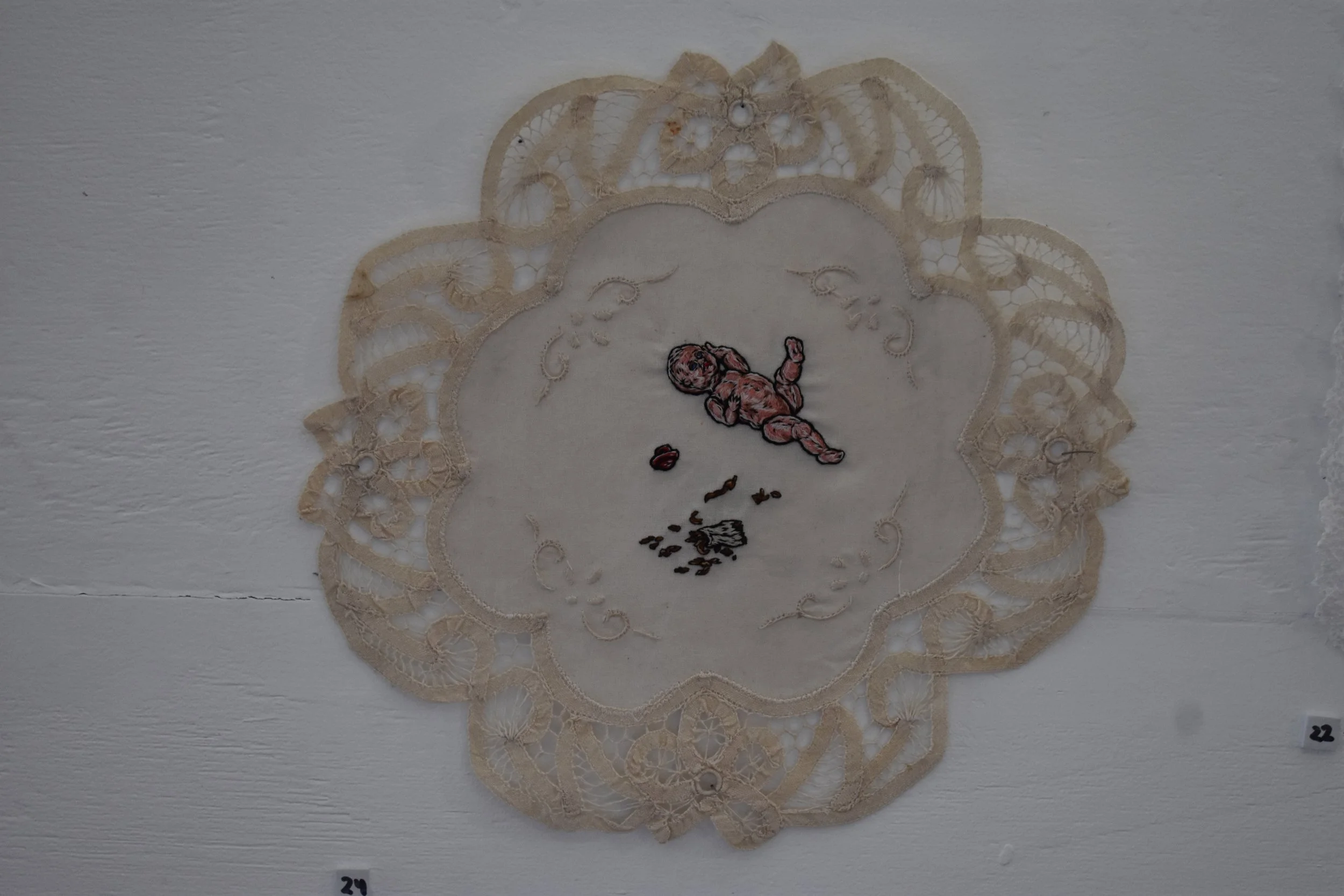 There Will Never Be Spit In The Coffee Received By My Hands - (Pink Plastic Baby, Red Button, Torn-off Cigarette End), hand embroidery on cotton doily, 30 x 28cm, $320 Sophie Shingles