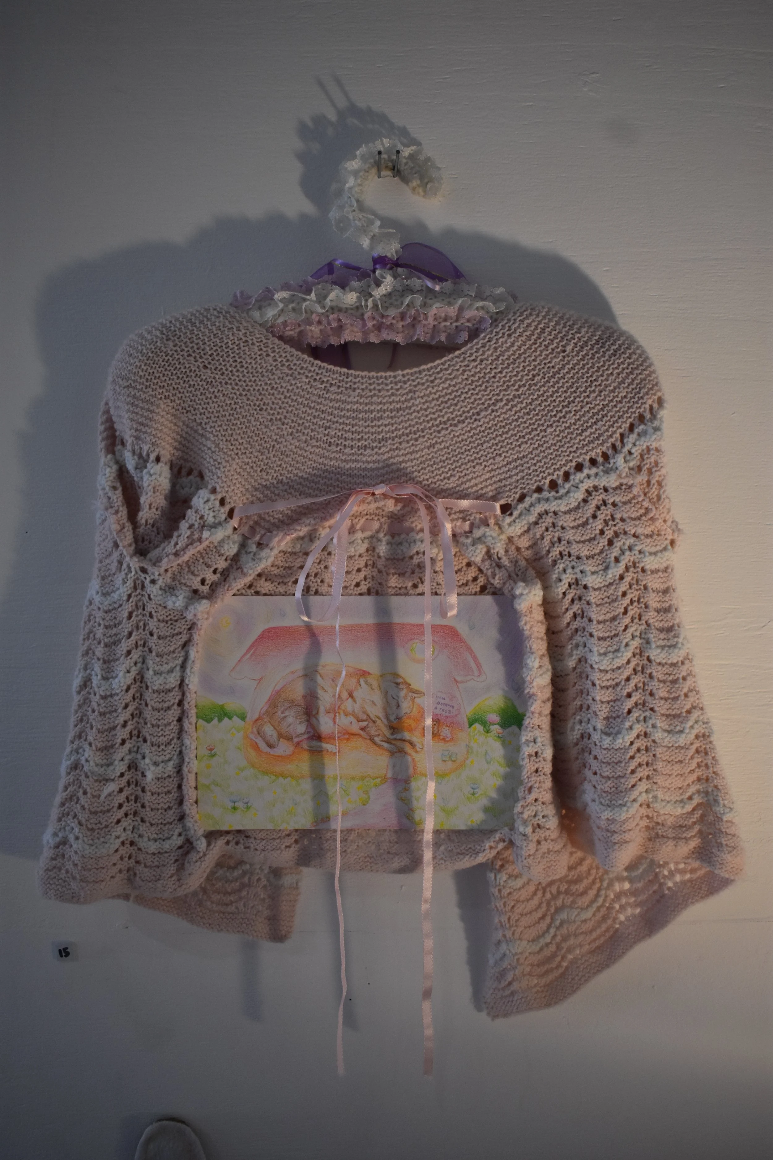 My Angel, recycled cardigan, hanger, thread and colour pencil on paper, $450