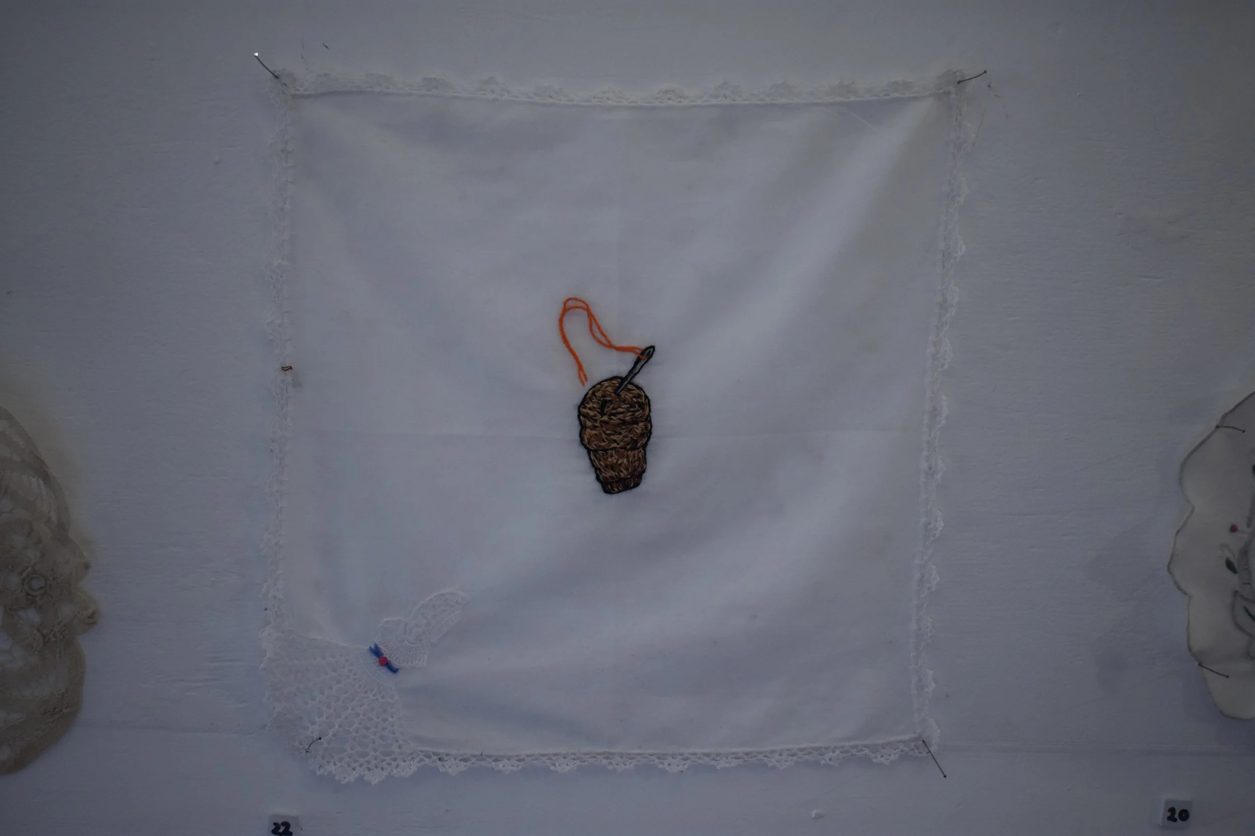 22. The Dreams Of Acting With Malice Wake Me In A Cold Sweat - (Wine Cork, Threaded Needle), hand embroidery on cotton hanky, 28 x 28cm, $220 Sophie Shingles